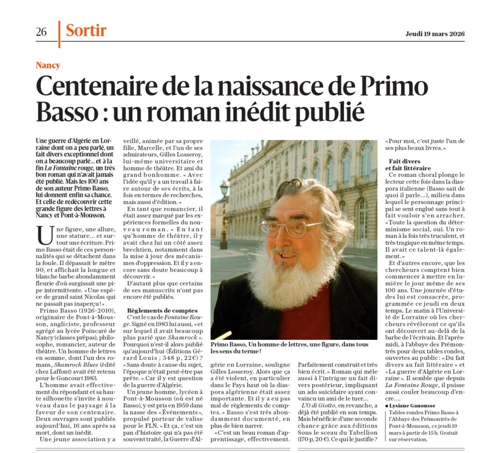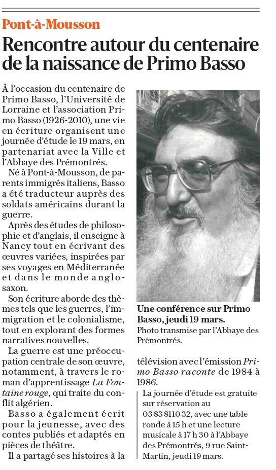 « Primo Basso aurait cent ans cette année. L’heure de la résurrection pour cette figure littéraire » (L’Est Républicain)Avr 9,2026Commentaires ferméssur « Primo Basso aurait cent ans cette année. L’heure de la résurrection pour cette figure littéraire » (L’Est Républicain)Meurthe-et-Moselle. Primo Basso aurait 100 ans cette année, l’heure de la résurrection pour cette figure littéraire